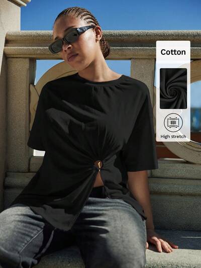 SHEIN Maija Plus Size Women's Cotton Round Neck Short Sleeve T-Shirt, With Metal Ring Design On Front Waist, Business Casual Basic Top,For Vintage Women Old Money Teacher For Women Romantic, Fashion, Versatile Summer Women Party Top Beach Holiday Vacation Going Out Graduation Elegant Women's Blouses Casual Blouses Formal Attire Work Office For Women
