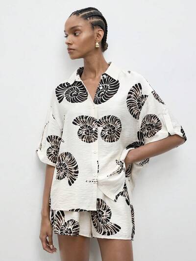 SHEIN Maija Women's Vacation Casual Seashell & Starfish Print Shirt And Shorts 2 Pieces Set  St Patrick's Day Women Easter Summer Outfits Easter Dress Women Party Top Beach Dress Summer Holiday Outfits Each Vacation Outfits For Women  Summer Outfit For Women Going Out Outfits Graduation Graduation Outfit  Casual Dresses  Casual Blouses For Women