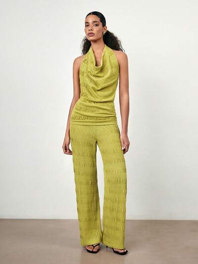 SHEIN Maija 2025 Summer New Women Green Textured Pants, Fashionable Simple Versatile Summer Elegant Outing Resort Straight Pockets Casual Slim Leg Office Pants,High Waist Spring Break Beach Music Festival Knit Maxi Trousers-25%