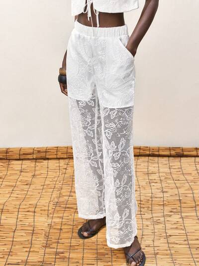 SHEIN Maija Women's White Summer Elastic Waist Solid Color Hollow Embroidery Fabric Sexy Fashion Simple Versatile Casual Bohemian Style Holiday Solid Color Wide-Leg Pants Beach Going Out-67%