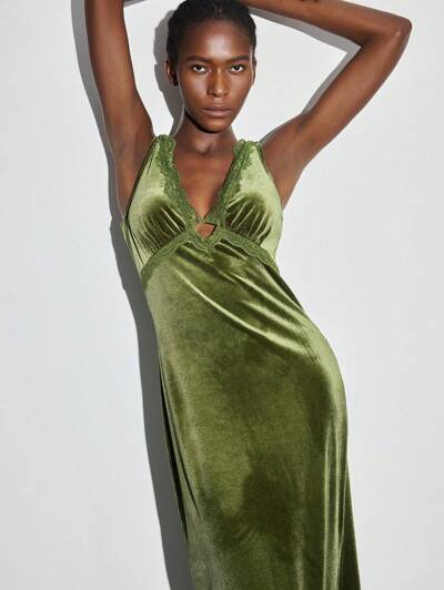 SHEIN Maija 2025 Classic Lace Patchwork Thick Strap Deep V-Neck Bodycon Dark Green Velvet Dress, Suitable For Early Autumn Party Season, Christmas Olive Green Velvet Dress Green Cocktail Dress Olive Dress Party, Fall Women Clothes,Winter Party,Halloween,Homecoming, Christmas Clothes,Christmas Dress,Dirndl,Date Night Outfits Women, Dress For Wedding Guest, Wedding Guest, Dresses For Wedding Guest, Wedding Guest Dress Elegant, Off The Shoulder, Business Casual Woman, Old Money Style Women, Going Out Tops Women, Winter Dresses For Women, Fall Wedding Guest Dress, Winter Outfit For Women