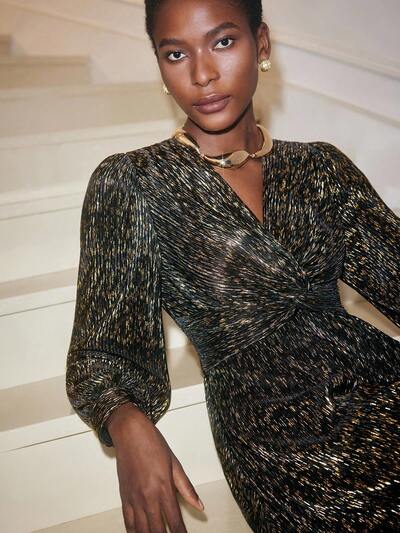 SHEIN Maija Black Gold Elegant Foil Pleated V-Neck Women's Twist Front Long Sleeve Dress, Suitable For Christmas, Party, Gathering Party Dress Elegant Dresses For Women Sequin Skirt Autumn Dress Halloween Costumes Christmas Outfit For Women New Year Women Summer Dresses For Women New Year Women Wedding Guest Dress Shiny Dress Women Dresses Autumn Winter Sequin Dress Winter Dresses For Women V-Neck Dress High Neck Halter Top Harlem Nights Top Stylish Clothing Collection