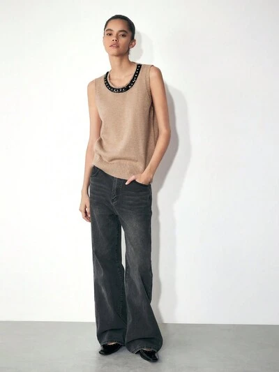 SHEIN Maija Women Apricot Casual Rhinestone Embellished Round Neck Solid Color Simple Stylish Long Sleeve Sweater, Suitable For Leisure & Everyday Wear, Autumn/Winter