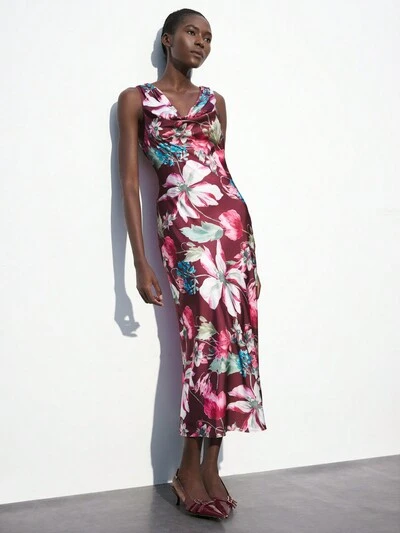 SHEIN Maija Damen elegantes Satin Blume Muster Maxikleid mit drapiertem Kragen, Herbst/Winter