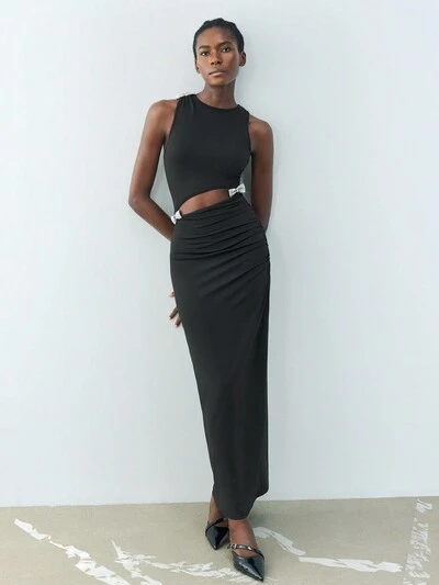SHEIN Maija Neues Frühjahrs schwarzes urban modernes Kleid mit Diamantenschleife, mittellange Länge, geeignet für Ausflüge, Urlaub und Urlaubspartys, 90er Jahre Frauenkleidung, retro nostalgisch, Musik Festival Boho