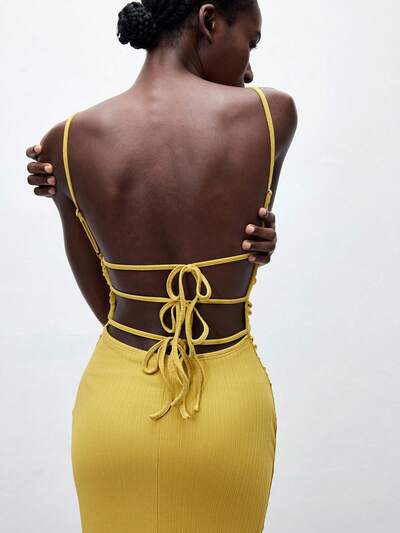 SHEIN Maija 2025 Sommer Neu Einstellbare Träger Rückenfreies Kleid mit Schleife, Strickstoff Damen Gelb, Sexy Mode Lässig Modern Urban Elegant Romantisch Business-Casual Täglich Büro Party Strand Musik Festival Hochzeitsgast Brunch Streetwear Schulanfang Herbst Y2K Stil