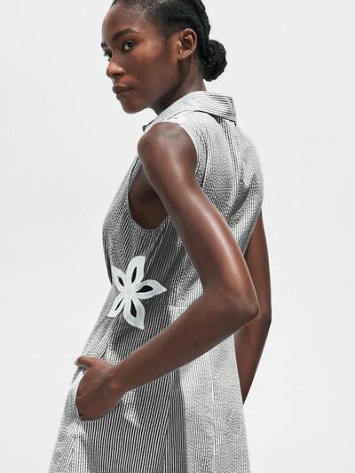 SHEIN Maija 2025 Herbst/Winter gestreiftes Hemdkleid mit Einzelreihe, Taille, Blumen-Hohlräumen, Taschen und ärmellos, moderner, eleganter, urbaner, romantischer, würdevoller, einfacher, vintage Stil, geeignet für Hochzeitsgäste, Geburtstag, Halloween, Business Lässig, Büro, Date, Party, Weihnachten, Neujahr-23%