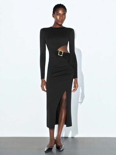 SHEIN Maija Vestido largo de mujer con abertura alta en el dobladillo, cinturón hueco en la cintura, unicolor, para primavera/otoño. Vestido con corte, abertura lateral, abertura en el muslo, hueco, para invitada de boda. Vestidos elegantes de mujer para fiesta, vestidos negros, vestidos elegantes para mujer, vestido formal negro, vestido para salir, vestidos modestos para mujer en otoño. Ropa de mujer de otoño, ropa de otoño, vestidos de cumpleaños para mujer, ropa de Halloween para mujer, vestido de invitada de boda.