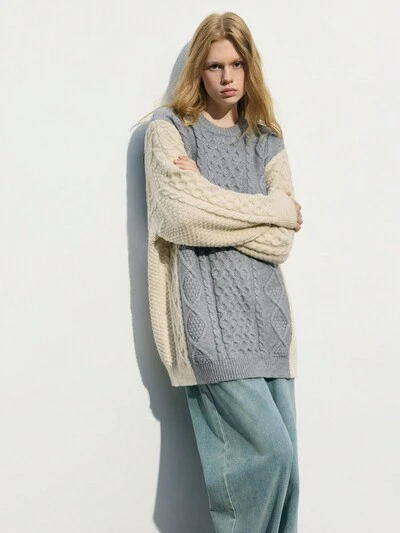 SHEIN Maija Suéter holgado de punto negro y blanco con estampado de patrón retorcido que da sensación de calidez, apto para otoño/invierno-60%