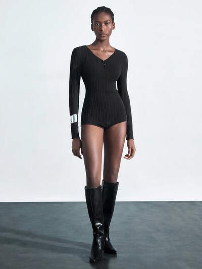 SHEIN Maija 2025 Mono elegante de manga larga con cuello en V profundo, ajustado y semitransparente, con volantes en el bajo, adecuado para la temporada de fiestas de principios de otoño. Mono negro de una pieza, mono de manga larga, ropa de otoño para mujer, ropa de invierno para mujer, conjuntos de otoño para mujer, Halloween, Navidad, casual de negocios, atuendos de oficina para mujer, ropa de trabajo para mujer, suéteres de otoño, suéter de Halloween