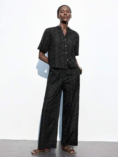 SHEIN Maija Blusa de mujer con escote en V, bordado de ojales negros y mangas cortas. Casual, holgada y cómoda para vacaciones, playa, festivales de música country y versátil