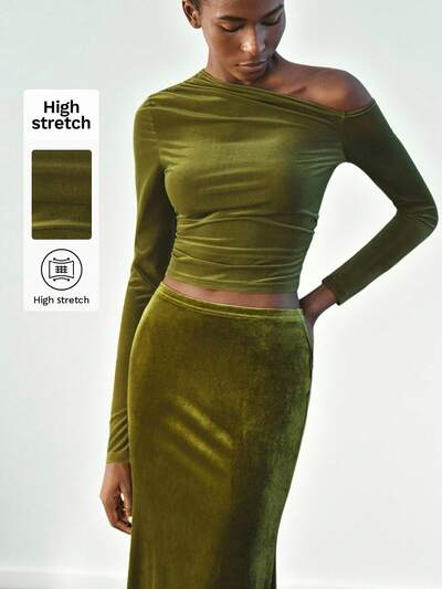 SHEIN Maija Camiseta de moda de manga larga con hombros oblicuos y fruncidos de unicolor para mujer