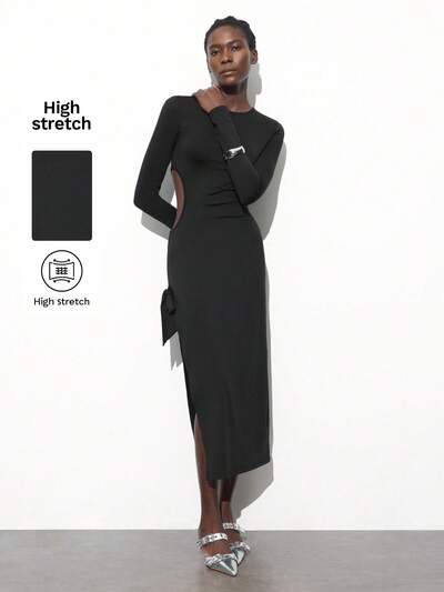 SHEIN Maija Vestido largo casual de ajuste delgado con cuello redondo, manga larga, abertura en la cintura y cordones laterales, color negro sólido, para inicios de primavera
