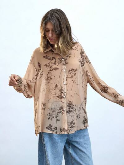 SHEIN Maija Blusa de gasa con estampado floral en caqui para mujer, de estilo moderno y boho casual, de corte holgado y liviana para primavera y verano, con botones delanteros, adecuada para festivales de música, cruceros e Ibiza