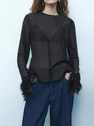 SHEIN Maija Camiseta de manga larga con cuello redondo negro para mujer, con adorno de pelusa, textura semitransparente, ajuste relajado, elegante, sexy y versátil para todas las estaciones