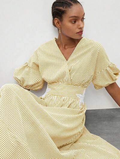SHEIN Maija Vestido de mujer con mangas de pétalos de hombros caídos, cruzado y envuelto, con cintura ceñida y rayas