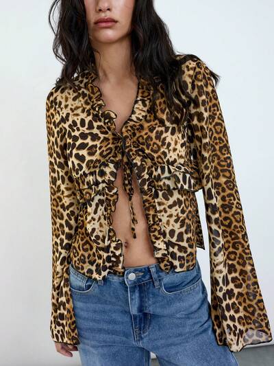 SHEIN Maija Blusa de dama con diseño de volantes, anudada y estampado de leopardo, elegante para invitada de boda, brunch, aeropuerto, vacaciones estilo bohemio, festivales de música, Pascua, graduación y uso casual diario - Nuevo lanzamiento de verano 2025