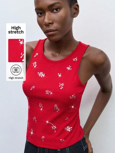 SHEIN Maija Top sin mangas casual de primavera con cuello redondo, decoración de strass roja y ajuste versátil para uso casual o de oficina