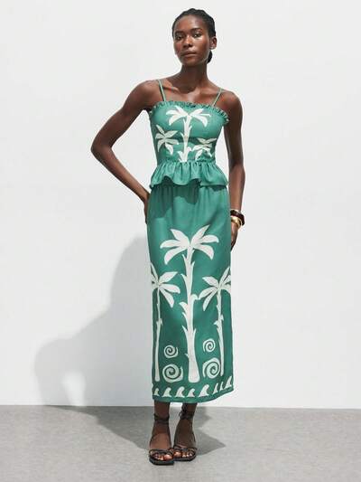 SHEIN Maija Falda casual de línea A con estampado floral y cintura elástica para mujeres, estilo bohemio hawaiano para festival de música y playa, 2025 Otoño Verde-60%