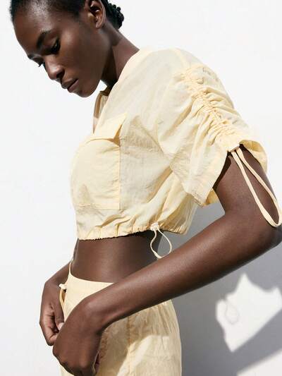 SHEIN Maija 2 piezas Conjunto informal de verano para mujer de vuelta al colegio con parte superior corta con bolsillos fruncidos de estilo cargo en color crema