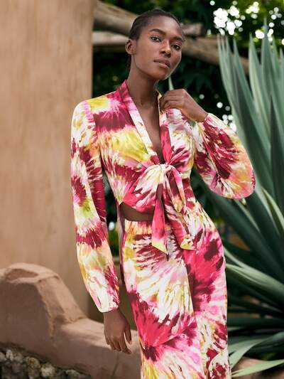 SHEIN Maija Blusa roja con estampado tropical efecto tie-dye, elegante y sexy blusa bohemia de manga larga con nudo delantero de estilo sencillo para el verano