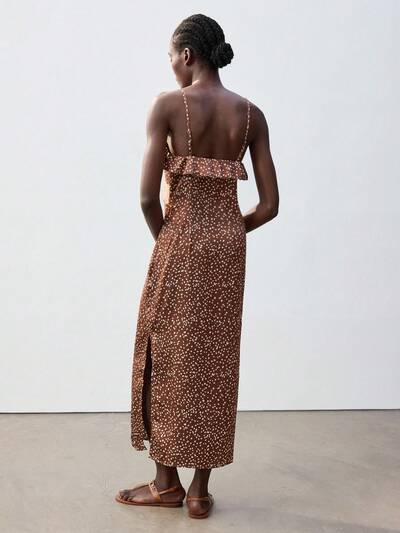 SHEIN Maija Robe longue de dame nouvelle pour le printemps et l'été, en satin tressé marron à pois, avec volants floraux, urbaine, moderne et élégante, romantique, convenant pour les sorties, les fêtes de vacances, les festivals de musique