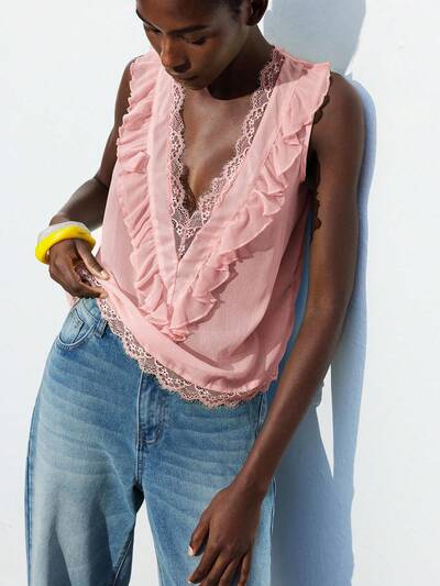 SHEIN Maija 2026 Printemps/Été Nouveau Chemisier Femme à Encolure V Profonde avec Volants sans Manches en Dentelle Patchwork, Style Élégant Urbain Romantique Country Music Festival Vintage, Convient pour Aéroport, Rue, Invité de Mariage, Anniversaire, Halloween, Décontracté Chic, Rendez-vous, Fête, Rentrée Scolaire