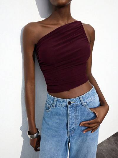 SHEIN Maija Nuova maglietta da donna con design asimmetrico sulle spalle, arricciata in rete, colore bordeaux, adatta per primavera/estate, San Patrizio, Pasqua, feste estive, vacanze al mare e altro per le donne