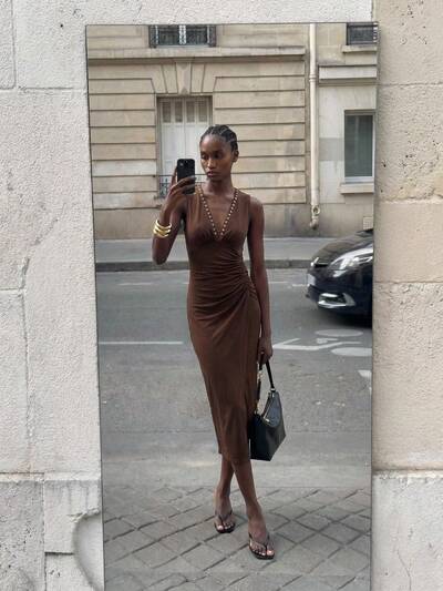 SHEIN Maija Idee di outfit per abiti, abito midi elegante da donna con scollo a V profondo, arricciato, con spacco, vita stretta, adatto per feste e matrimoni, abiti eleganti per feste, abiti estivi da donna con spacco, abiti di lusso da donna, abiti eleganti da donna, abito marrone, abito da donna per occasioni formali
