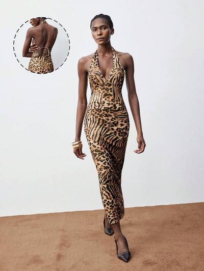 SHEIN Maija Abito estivo da donna alla moda con stampa animale, senza schienale e con collo alto