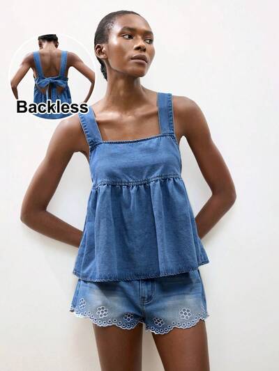 SHEIN Maija Blusa in denim casual senza maniche e senza schienale con lacci, estiva