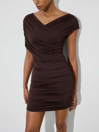 SHEIN Maija Abito mini donna di moda a tinta unita con scollo a V e pieghe