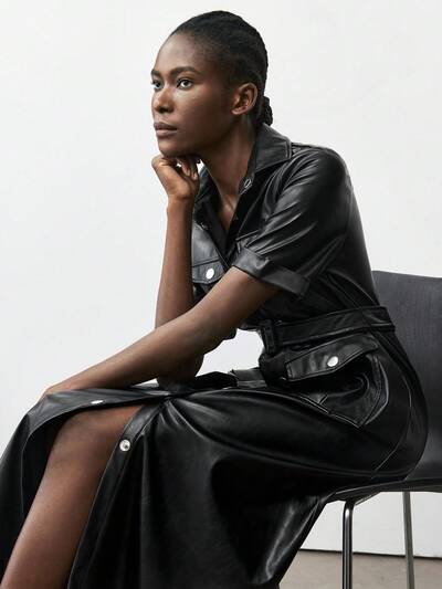 SHEIN Maija Abito in tessuto PU nero con decorazione in metallo argento, moda urbana moderna e versatile per tutte le stagioni