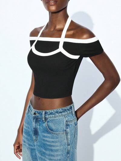 SHEIN Maija Maglietta a maniche corte casual da donna con scollo a spalla e profili a contrasto, aderente e corta, top estivo, carino, adatto per uscire, top da donna, top da donna per club, sexy, adatto come regalo di compleanno
