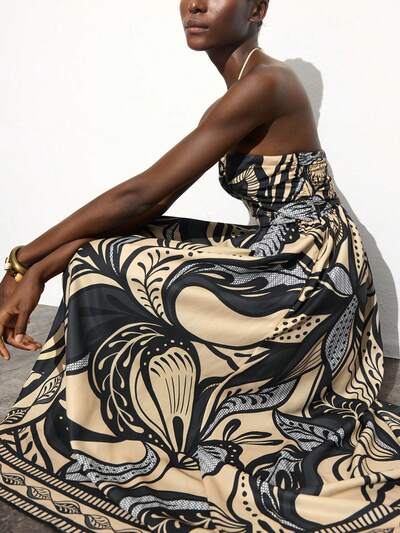SHEIN Maija Vestito lungo stile boho da donna stampa floreale albicocca e nero, collo alla halter, schiena scoperta, stile elegante, professionale, adatto per laurea, casual, festa, vacanze-27%