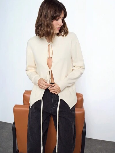 SHEIN Maija 女性用 アイボリー リボン付きカーディガン、ユニークデザイン 秋冬用、快適、ソフト、リバーシブル、蝶々3つ装飾、ドロップショルダー 長袖、スモールスタンドカラー ニットセーター-60%