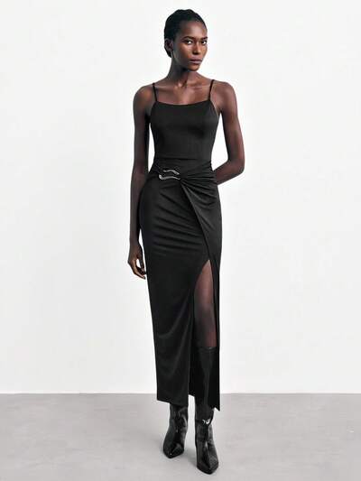 SHEIN Maija 2025年 エレガントなメタルデコレーション スパゲッティストラップ フィットロング ブラックドレス、初秋の学校復帰、パーティー、キャンパスダンスに適しています