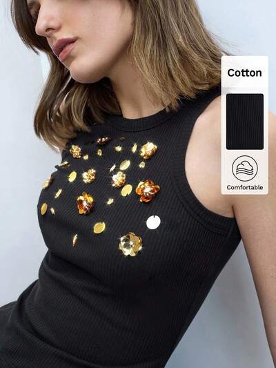 SHEIN Maija 女性用 夏 ファッション性豊かで多用途 ラウンドネック メタル フローラル 3Dディテール ノースリーブ ニットボディコン ミニドレス、バカンス、音楽フェス、パーティー、独立記念日、プライドマンス、夏服