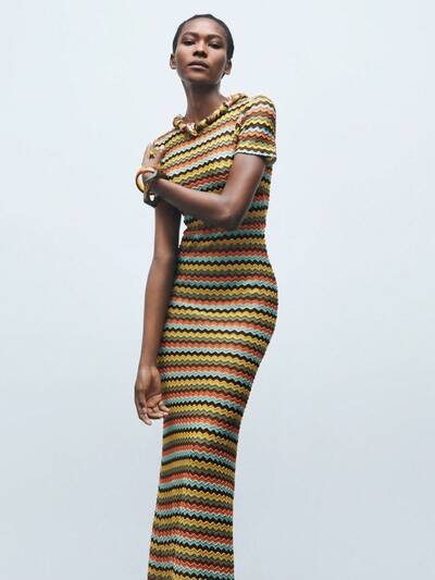 SHEIN Maija マルチカラーストライプ フィットクルーネック 半袖 マキシワンピース、シック バケーション ロマンチック カジュアル 洗練されたファッション幾何学柄ジャカード ニット ビーチ ボヘミアンスタイル バケーションドレス