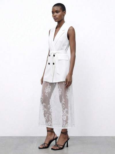 SHEIN Maija レディース 無地 ダメージ襟 ダブルブレスト ベスト とレースミディスカート エレガントな2ピースセット-27%