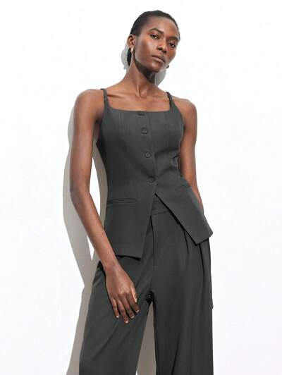 SHEIN Maija 2025年秋冬新作 レディース グレー 調整可能なストラップ オフィスウェア ノースリーブトップ、スタイリッシュ、エレガント、仕事、カジュアル、通勤、音楽フェス、ビーチバケーション、お出かけ、結婚式、卒業式、空港、ビーチ、コンサート、パーティなどのフォーマルな場面に適しています-23%