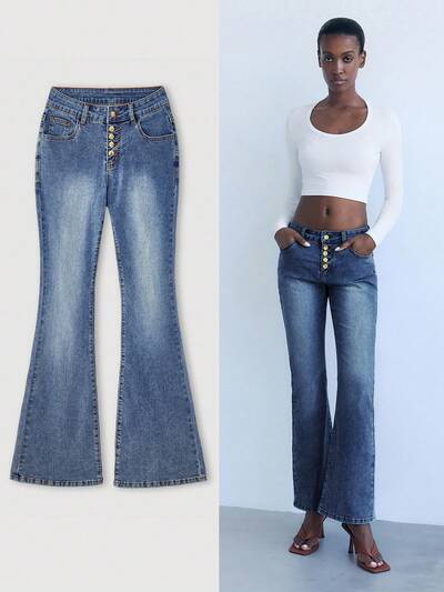 SHEIN Maija レディース カジュアル ウォッシュ スリムフィット フレアジーンズ-55%