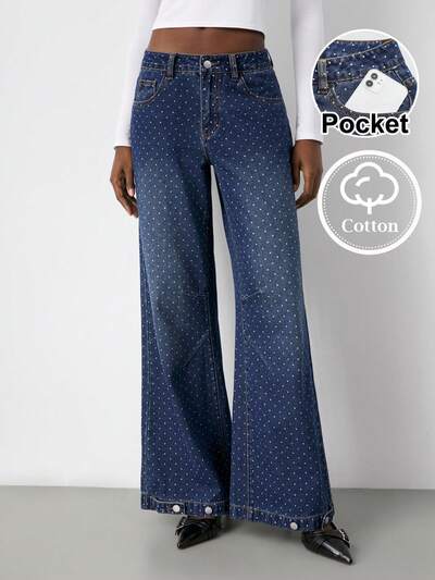 SHEIN Maija ポルカドット柄ワッシュ加工フレアジーンズ、カジュアルファッション、秋-55%