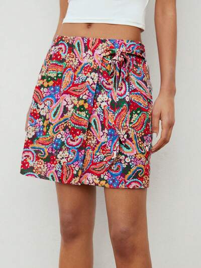 SHEIN Maija タイラップ プリント デザインセンス ミニスカート レディース、快適で多用途、春夏、ビーチ、バケーション、フェスティバル、ボヘミアンミュージックフェスティバルに適しています-23%