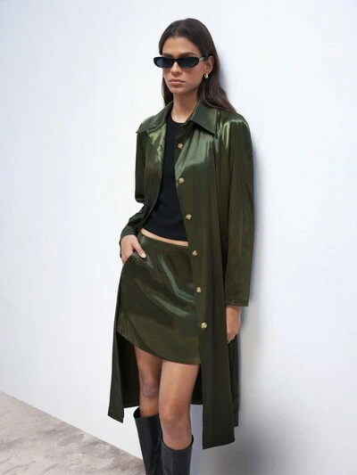 SHEIN Maija 女性用ダークグリーンサテン ドリル ファッションボタンフロントポケット 多目的 長袖 クリスマス カジュアルホリデージャケット、レギュラーフィット