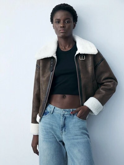 SHEIN Maija レディース ブラウン レザー&ファーパッチワーク ロングスリーブ ジップアップ カジュアル シンプル ボンバージャケット、秋冬-60%