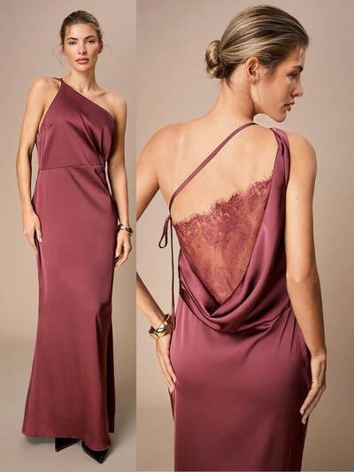 SHEIN Maija エレガントなパープル レッド マーメイドヘム レースパッチワーク バックレスドレス レディース