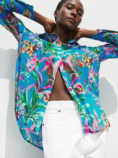 SHEIN Maija ブルー プリントパターン ルーズ 長袖 シフォンブラウス レディース、ボヘミアン ホリデー ビーチ カジュアル ルーズシャツ-32%