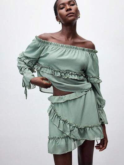 SHEIN Maija ミントグリーンのボヘミアンバケーションスタイル、ドロストリング ラッフルスリーブ ウィメンズトップ、ラッフルデザイン ウィメンズミニスカート、カジュアルルーズフィット 2ピースセット、秋のカントリーミュージックフェスティバルに最適、シフォン 軽量 快適 エレガント-60%