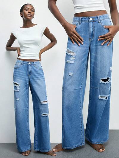 SHEIN Maija レディース カジュアル ファッション ストリートシック 通勤 ダメージ加工 ゆったり ワイドレッグジーンズ-44%